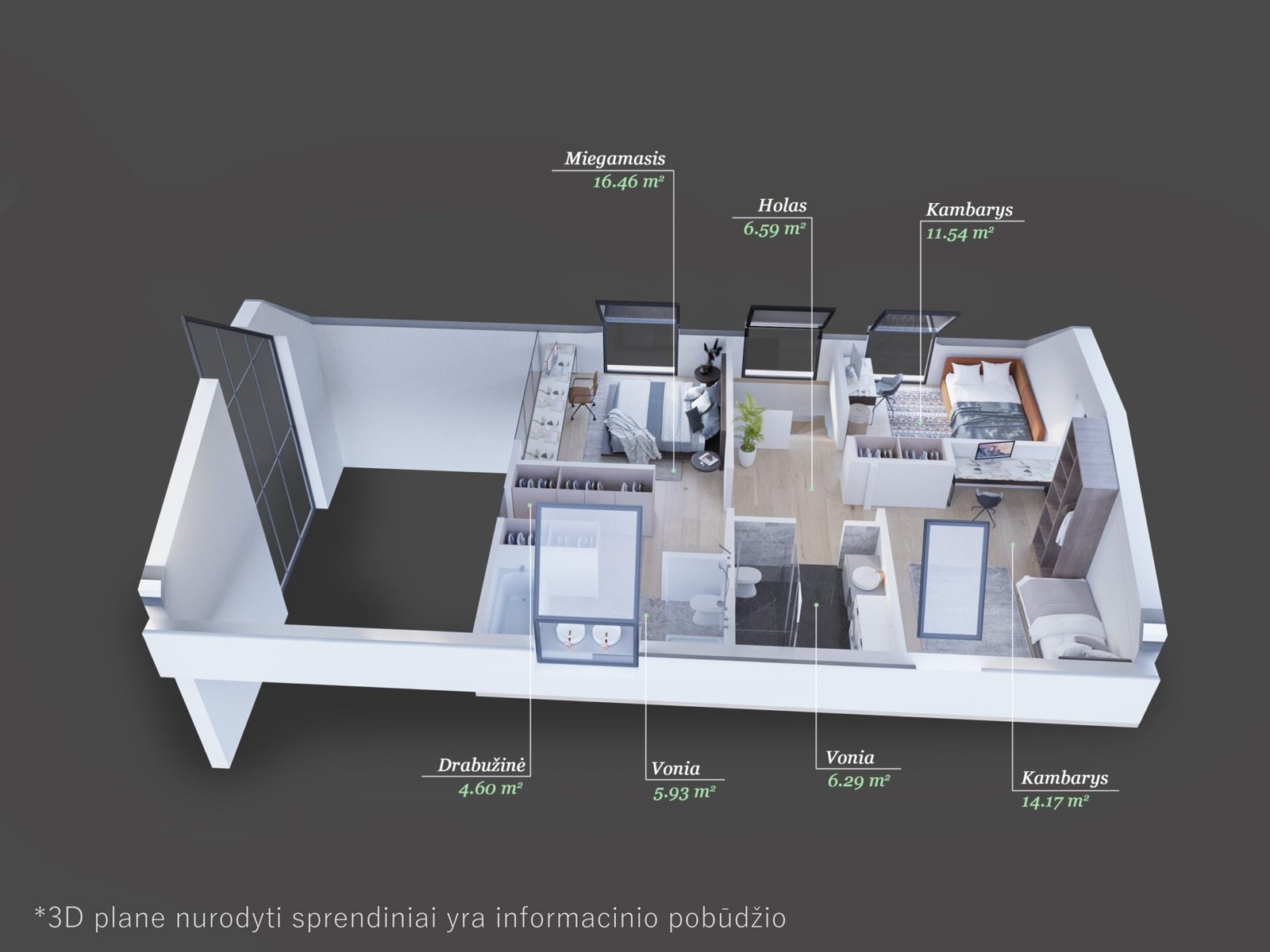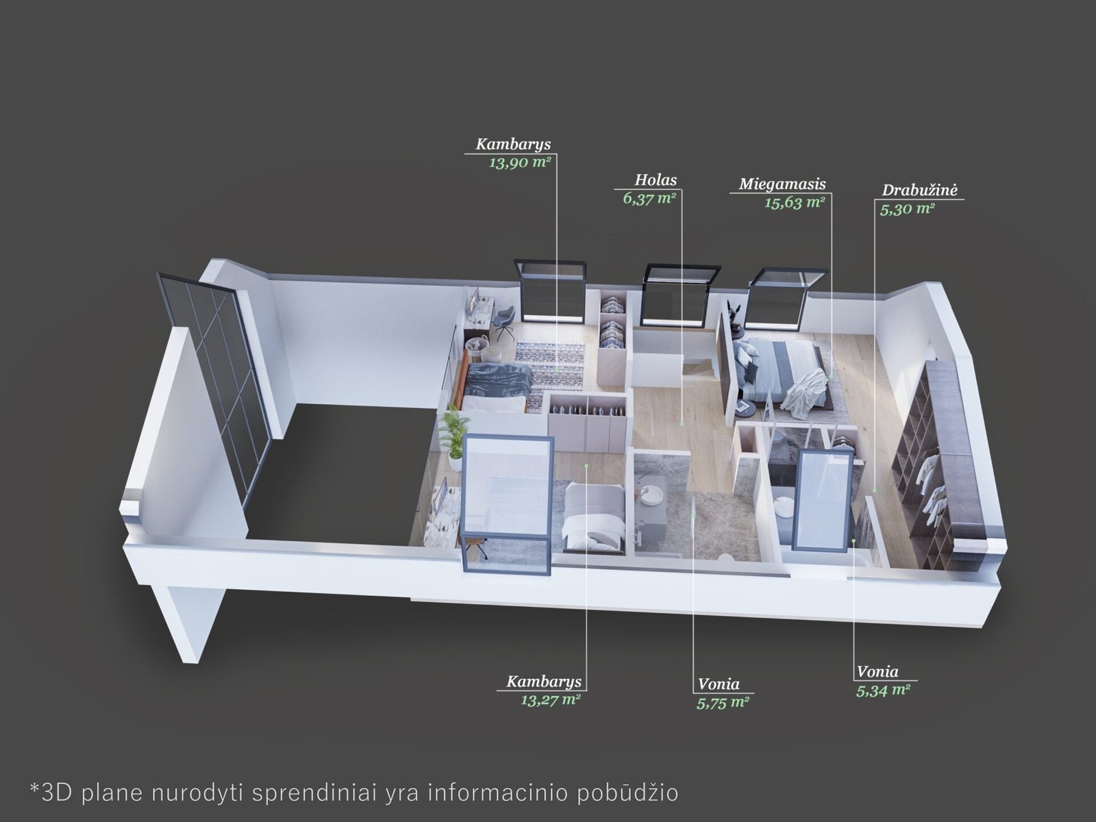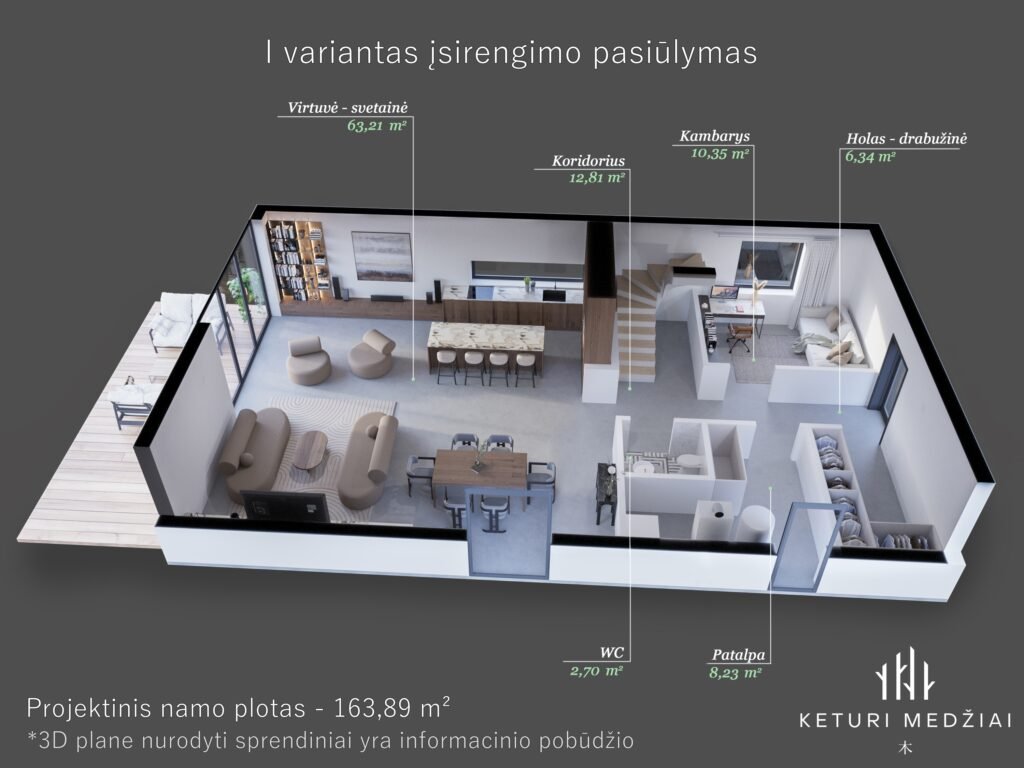 Projektinis namo plotas 164 kv. m. 5 kamb. Projekte siūlome du įsirengimo variantus. Iš kurių I aukšte suplanuota didelė su virtrininiais langais erdvi net 63 kv. m. svetainės ir virtuvės erdvė, kurios lubų aukštis iki 8 m. Darbo kambarys, drabužinė, WC, talpi katilinė. II aukšte – vienoje aukšto pusėje tėvų zona, kurioje suprojektuotas miegamasis kambarys su privačiu vonios ir drabužinės kambariu, kitoje pusėje, su tėvų kambariu nesiribojantys 2 vaikų miegamieji kambariai ir jiems skirta vonia.