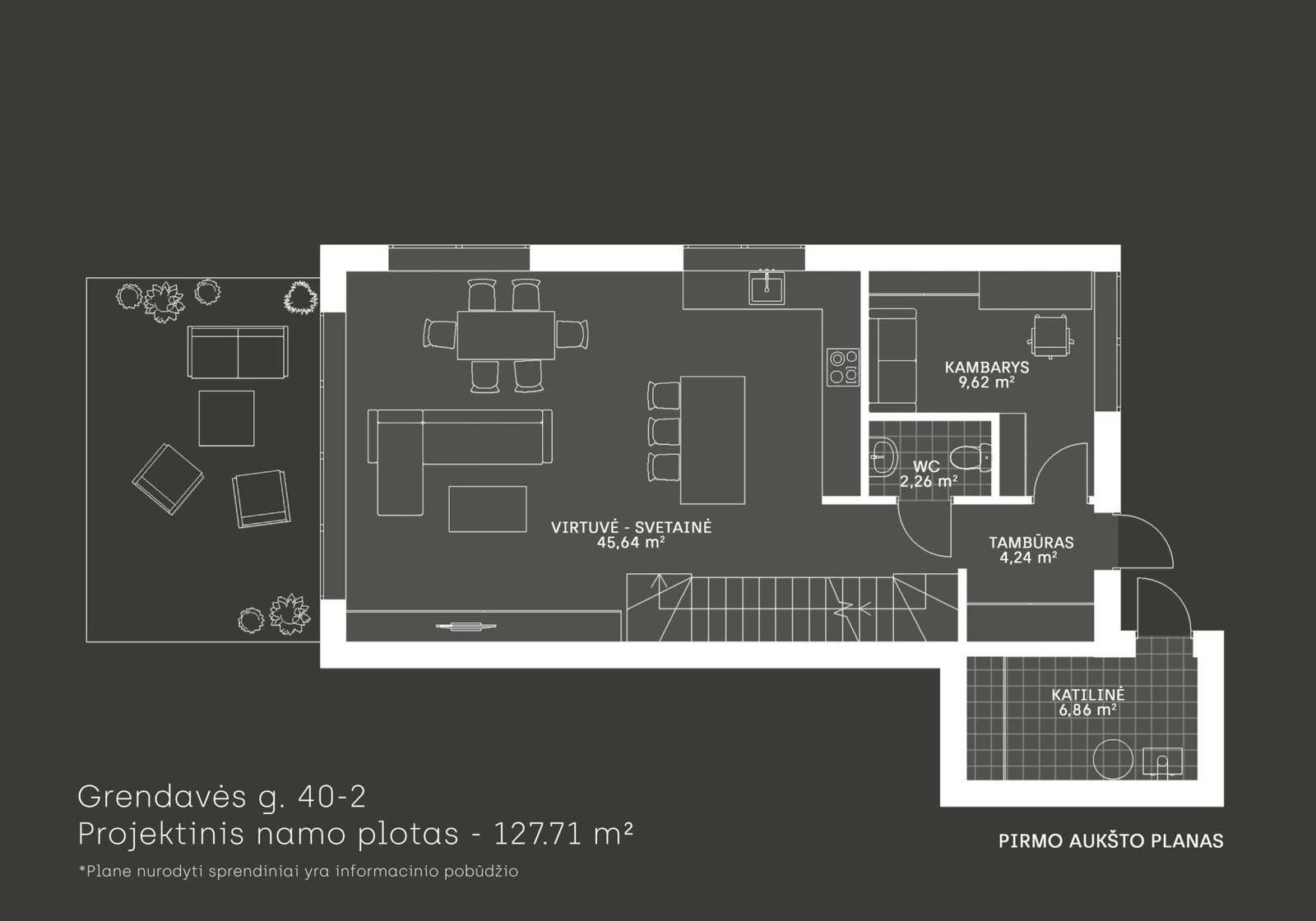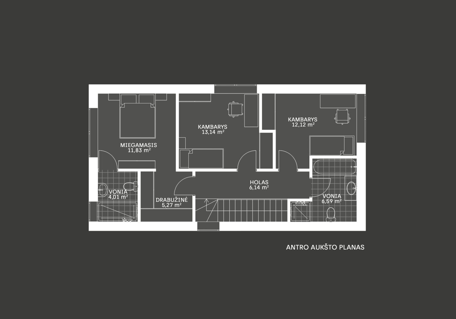 Suprojektuota didelė (46 kv. m) svetainė, numatyta erdvė darbo kambariui, II aukšte 3 miegamieji kambariai, kurių vienas su privačia vonia ir drabužine.
