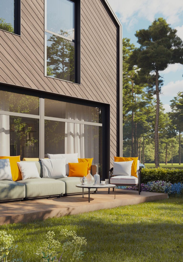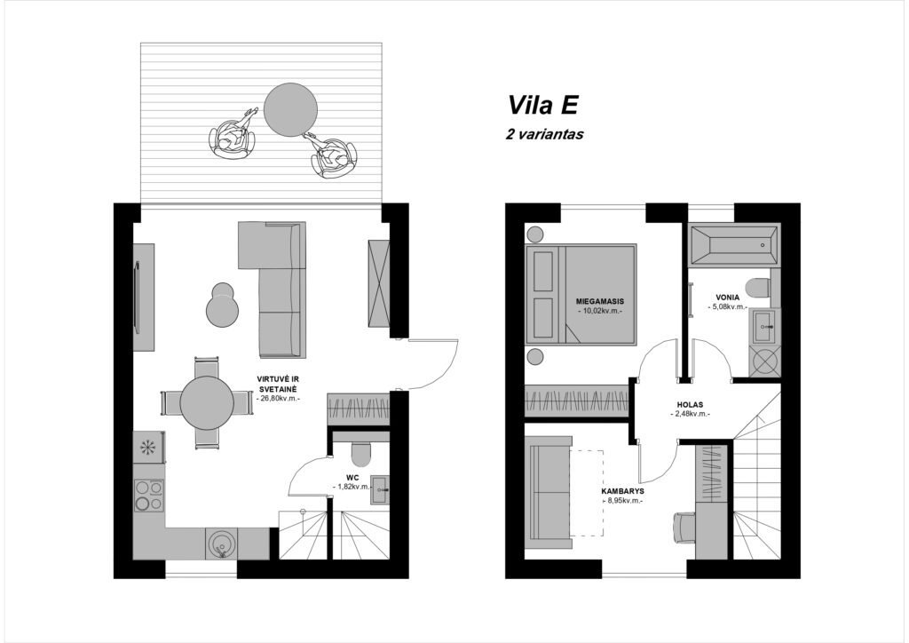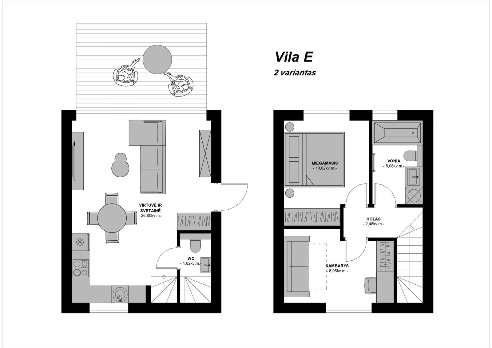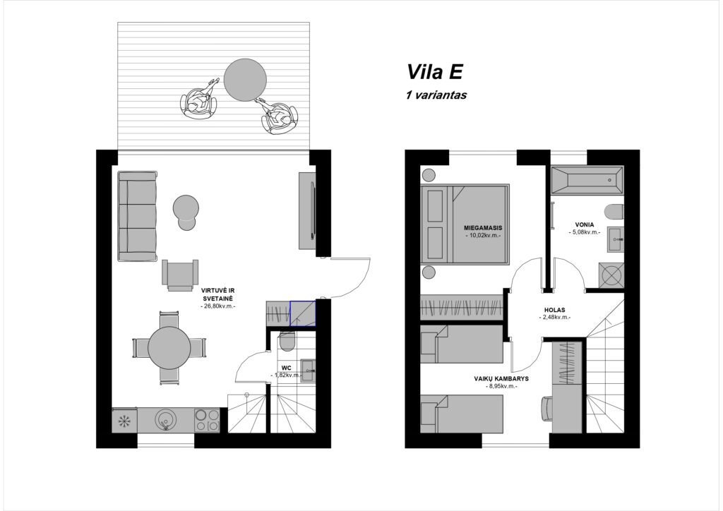 Estetika ir kokybė, architektūros darna. Vilų fasadą puošia degintos medienos ir „Classic“ skardos fasado apdaila, sumontuoti mediniai stumdomų sistemų langai, įrengiamos termo medienos terasos. Būstai apsupti žalumos, o per langus atsiveria vaizdas į Buivydiškių tvenkinį, ištisus metus žaliuojančias pušis.