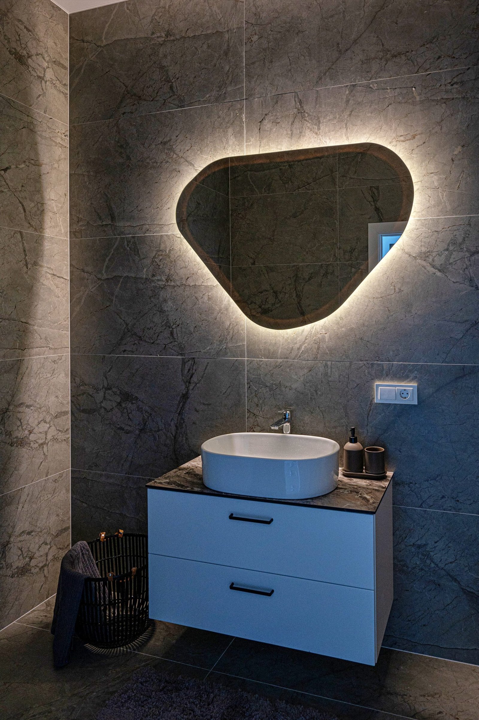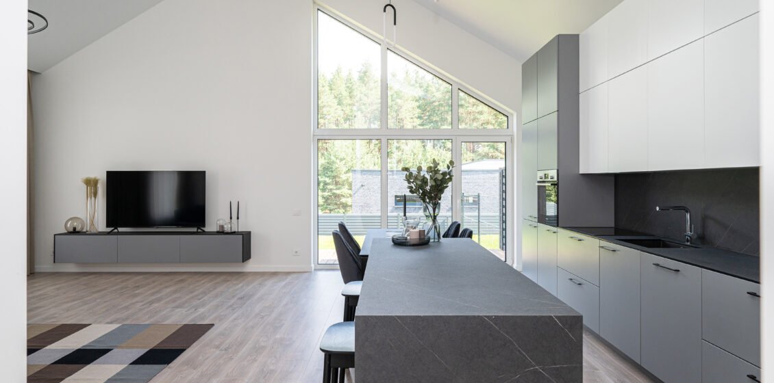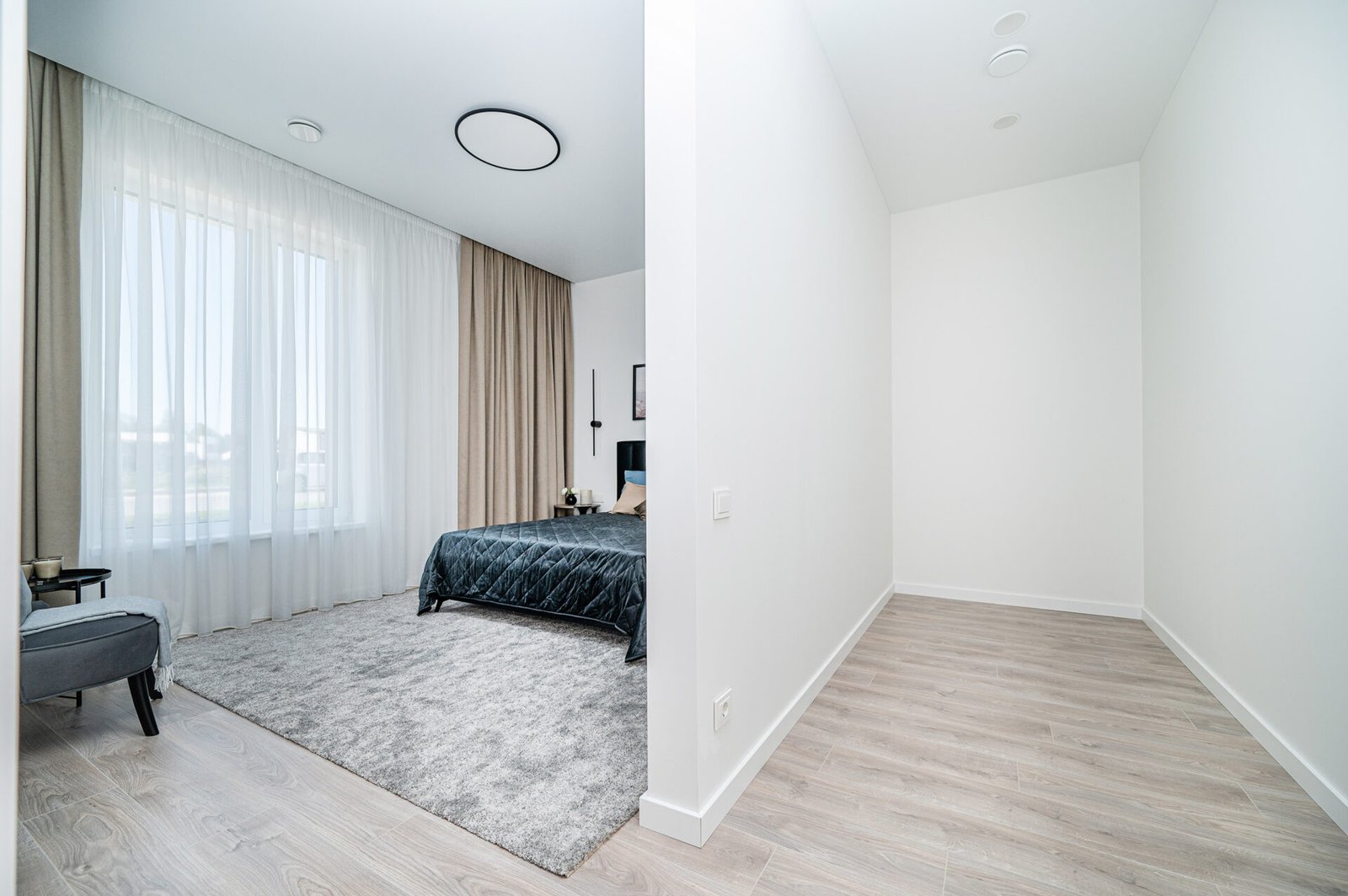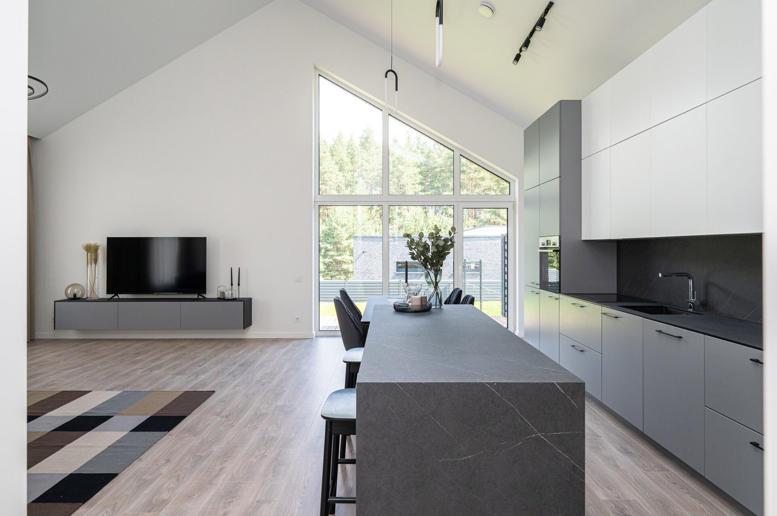 Namuose įrengta bendra svetainės ir virtuvės erdvė su ypatingai aukštomis lubomis ir panoraminiais langais nuo stogo iki grindų, 3 miegamieji kambariai, viename iš jų įrengta ir atskirta įeinama drabužinės patalpa, 1 vonios kambarys, atskiros rūbinės ir katilinės patalpos.