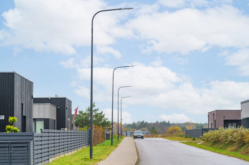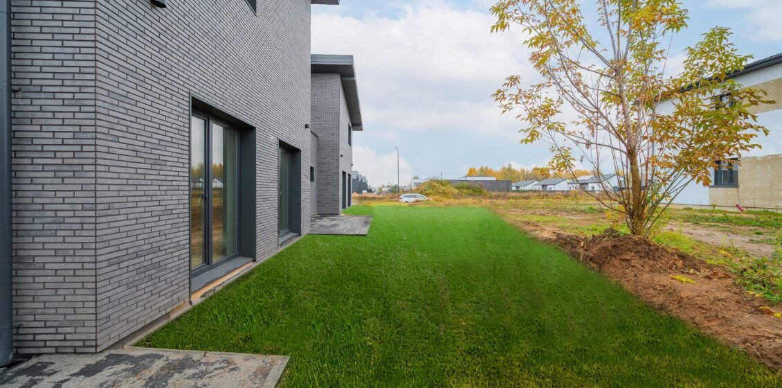 ~4 arų kiemuose išklojama ruloninė veja, sklypas atveriamas rombo tipo tvora, kiekvienas namas turi suformuotą privatų įvažiavimą.