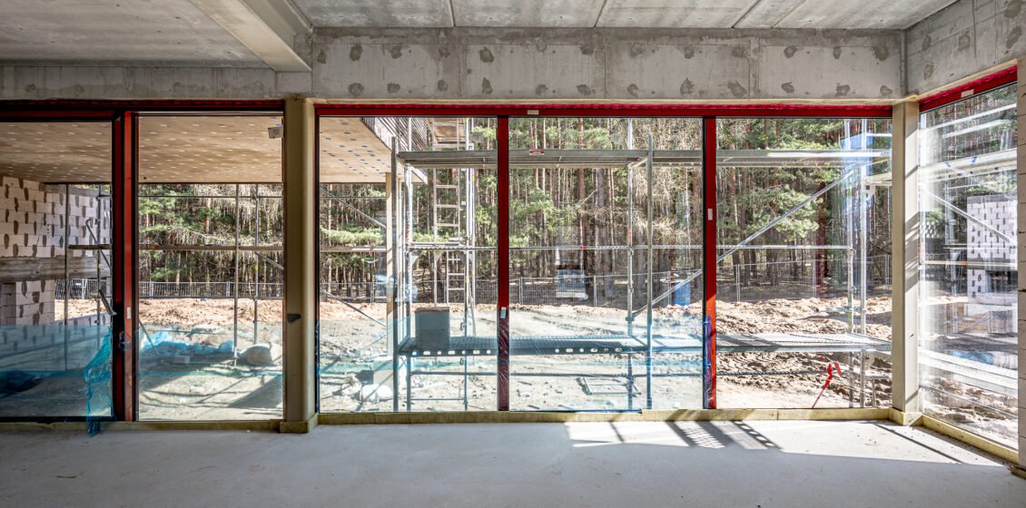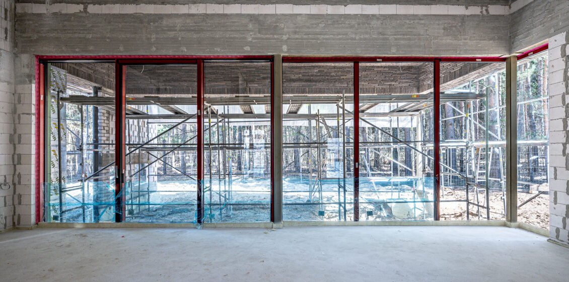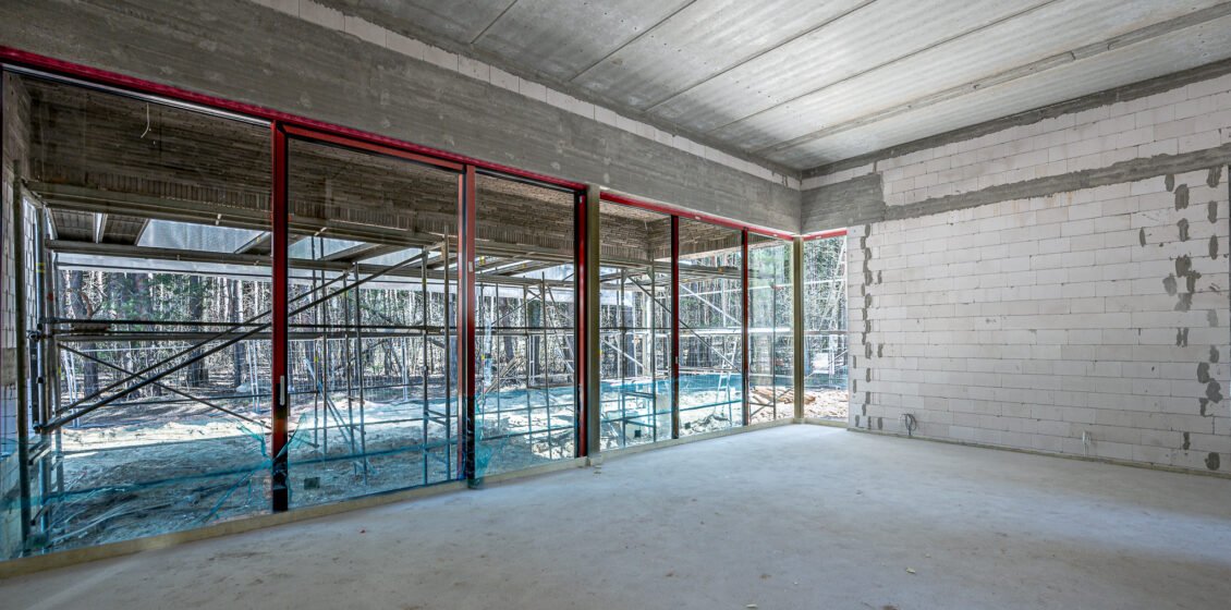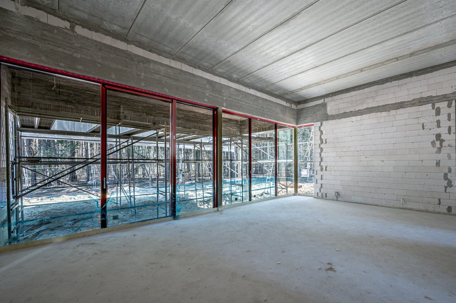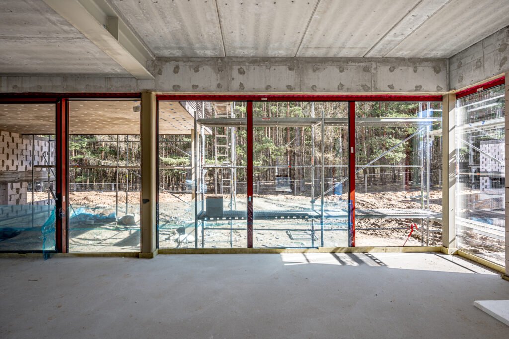 Vidurinis namas su didžiausia 74 kv.m svetaine ir plačiausia net 12 metrų ilgio langų siena pro kurią matosi pušynas.